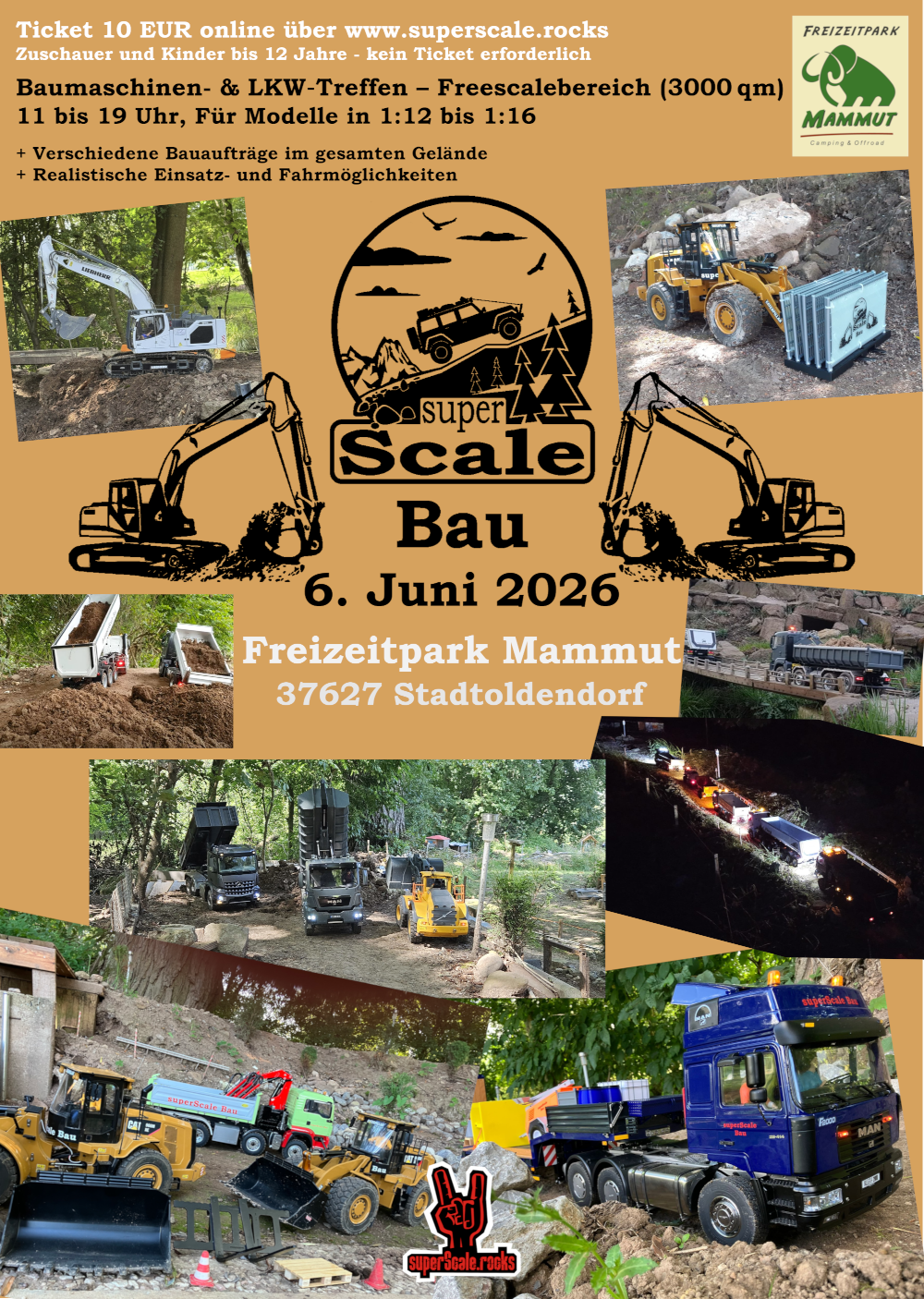 Am 6. Juni 2026 ab 11:00 Uhr öffnen wir exklusiv den gesamten superScale Freescalebereich (also nicht nur den Baumaschinenbereich) für alle Fans von Baumaschinen und Funktionsmodellen. Bringt Eure Baumaschinen und LKWs im Maßstab 1:12 bis 1:16 mit und arbeitet auf rund 3000 m² des Freescalebereichs verschiedene Bauaufträge realistisch ab.